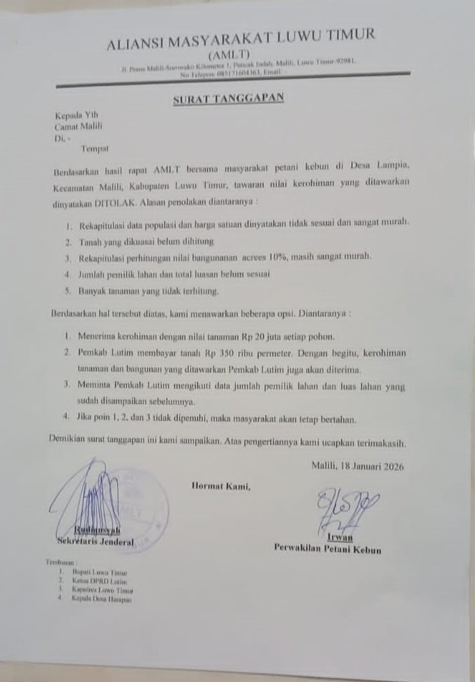 Surat tanggapan permintaan ganti rugi tanah dan pohon tersebut disampaikan kepada Pemerintah Kecamatan Malili yang ditandatangani atas nama Irwan sebagai perwakilan petani kebun dan Rudiansyah sebagai sekretaris jenderal tanggal 18 Januari 2026.