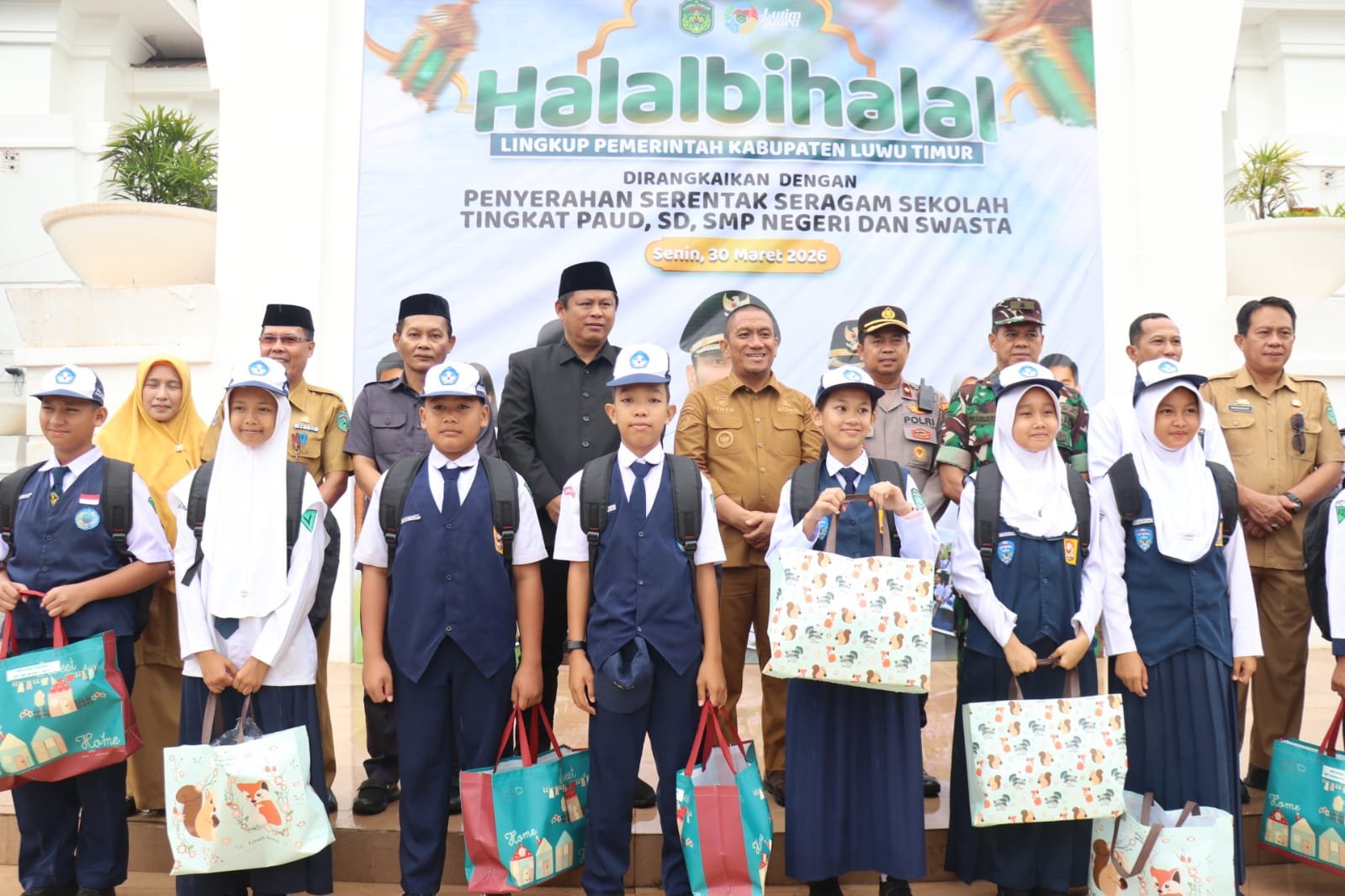 LUWU TIMUR – Bupati Luwu Timur Irwan Bachri Syam menyerahkan bantuan seragam sekolah untuk 16.253 siswa PAUD hingga SMP, termasuk sekolah swasta, di halaman Kantor Bupati saat apel pagi pertama pasca-libur sekolah dan kerja, Senin (30/3/2026).