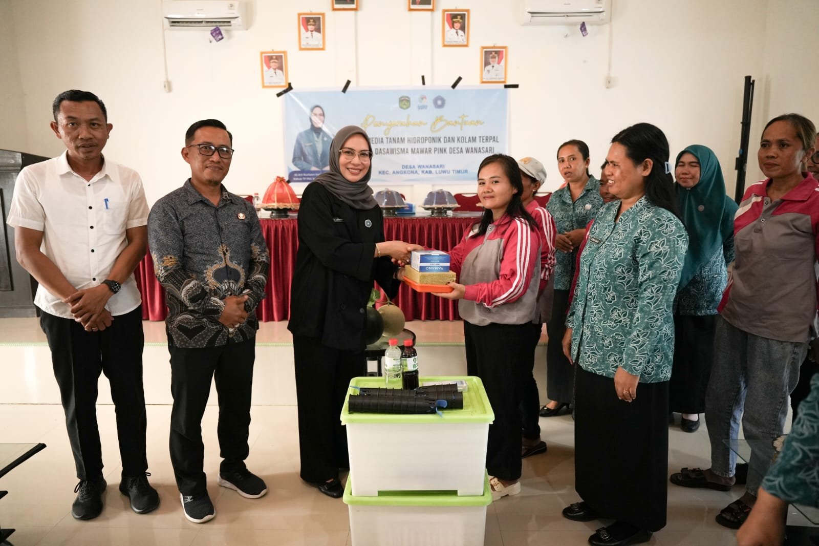 LUWU TIMUR – Tim Penggerak PKK Kabupaten Luwu Timur menyerahkan bantuan paket media tanam hidroponik dan kolam terpal kepada Dasawisma Mawar Pink di Desa Wanasari, Kecamatan Angkona, Rabu (8/1/2026).